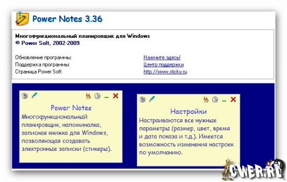 Power Notes - простой органайзер, планировщик и напоминалка для дома и офиса, позволяющая создавать электронные заметки и показывать их в нужный момент времени. Органайзер очень прост в использовании и нетребователен к ресурсам.