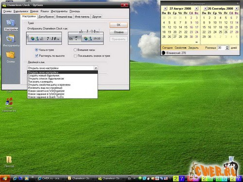 Цифровые часы для замены стандартных часов Windows. CD-будильники, атомные часы, временные зоны, календари обычный и женский, дни рождений: есть встроенный календарь (лунный и обычный), календарь месячных циклов для женщин, интерфейс меняется при помощи скинов, причем поддерживаются скины от Winamp'а.