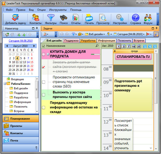 LeaderTask - это умный органайзер для лидеров! Интеллектуальная система управления проектами, событиями, задачами, контактами, освободит вас от рутины и даст больше времени для творчества. LeaderTask поможет вам избавиться от различных поглотителей времени, поможет вам увидеть четкую перспективу жизни, иметь подробный обзор дел, задач, вы будете ставить более высокие цели и достигать их. Кроме того, LeaderTask - это еще и удобный менеджер проектов, с помощью которого можно легко планировать и управлять вашими личными делами, а также бизнес проектами.