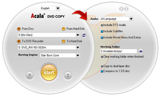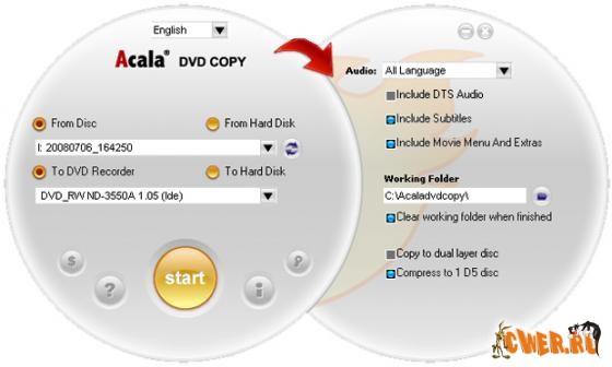 Acala DVD Copy - это приложение для копирования видео DVD дисков. Acala DVD Copy - это копирование содержимого на жесткий диск, прожиг (запись) видео на DVD-R(W), DVD+R(W) носители, копирование DVD-5 и DVD-9 с записью на DVD-9 Dual Layer, сжатие видео с DVD-5, DVD-9 до размеров DVD-5, выбор файлов для копирования или извлечения, удаление ненужных файлов (субтитры, аудио и языковых файлов) с копированного на жесткий диск DVD, автоматическая подготовка проекта к записи на DVD, высокая скорость и качество, простой и удобный интерфейс.