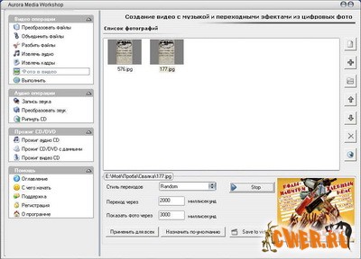 Aurora Media Workshop является программой, включающий в себя полный спектр средств для работы с видео и аудио файлами. Аудио и видеo конвертер, нарезка и соединение треков, граббер аудио CD, извлечение аудио из видео файлов, прожиг CD, создание видео CD из набора фотографий с множеством эффектов перехода, извлечение картинок (фреймов) из видео файлов, граббер DVD (VOB, DAT) в видео форматы, а аудио в MP3, WMA, WAV форматы, поддержка: AVI, MPEG1, MPEG2, ASF, WMV, VOB, DAT, DivX, XviD, MP3, WMA, WAV, OGG и других форматов. Короче целый мультимедийный комбайн!!!