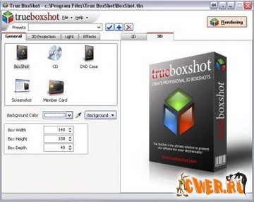 True BoxShot - программа для создания трехмерных графических изображений коробок для софта, клубных карт, компакт-дисков, DVD-коробочек. Успех продукта во многом зависит от его упаковки и презентации потребителям - это закон рынка. Для компьютерных программ так называемая упаковка и презентация делаются с помощью боксов. Боксы - это первая вещь, на которую обращает внимание покупатель при выборе программы. Дальше идет презентация программы, посредством которой покупатель может лучше ознакомиться с программой, что оставляет позитивное впечатление у него. Качественные картинки, создаваемые с помощью True BoxShot делают виртуальную презентацию любого продукта особенно привлекательной и запоминающейся.