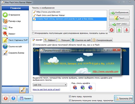 Aleo Flash Intro Banner Maker - уникальная программа для всех любителей создания flash баннеров и анимаций. Умеет сохранять файлы в SWF, GIF, AVI форматы. Обладает простым и многофункциональным интерфейсом в стиле мастера, который поможет вам с легкостью и профессионализмом сотворить небывалые по красоте и креативности баннеры, кнопки, ролики или просто надписи, используя всего пару щелчков мыши.