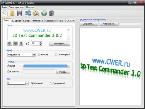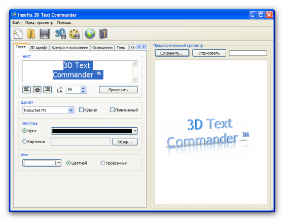 Insofta 3D Text Commander - программа, которая преобразует любой текст в трехмерный, позволяя создать свой уникальный логотип, баннер или слоган, а также позволит сохранить их на компьютер для последующего использования на ваших веб-страницах, документах или презентациях. Программа позволит создавать баннеры, флаера, брошюры и кнопочки с 3D текстом, тенями и отражениями. Программа очень проста в использовании, благодаря легким настройкам и простому и понятному интерфейсу.