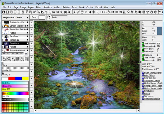 TwistedBrush - программа для художников. Она имеет большое количество самых разнообразных инструментов для рисования, от красок до мелков и карандашей. Эта программа глубоко поражает буквально с первого запуска. Интерфейсом Twisted-Brush мало похож на другие редакторы, хотя и предоставляет все необходимые возможности: работа с буфером обмена, зуминг и, конечно же, рисование. Причем рисующий инструмент только один — кисточка, зато количество (более 3000 штук!!!) и качество пресетов для рисования, а также многообразие форм и регулируемость размеров и цветовой гаммы позволяют человеку, не особо одаренному художественными талантами, буквально за пару минут изобразить то, что — возможно, более аккуратно и качественно, конечно — профессионал, работающий в другом редакторе, рисовал бы, наверное, не один час.