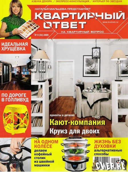 Иллюстрированный журнал, созданный на базе телепередачи канала НТВ "Квартирный вопрос" с детальной проработкой проектов, разбором дизайнерских решений, описанием использованных материалов. Полноцветный глянцевый журнал, посвященный интерьеру и дизайну, полностью соответствует свою телевизионному аналогу – и по тематике, и по уровню качества. Весьма достойное издание для тех, кому нужна интересная и достоверная информация, чтобы сделать правильный выбор при перепланировке и оформлении своей квартиры.