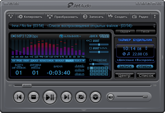 jetAudio является, пожалуй, самым навороченным и мощным из мультимедийных центров - целая аудио/видеосистема. Умеет проигрывать MP3, MP2, WAV, MID, REAL AUDIO/VIDEO, S3M, MOD, MPG, AVI, MOV, Video/Audio CD, RealPlayer G2 и некоторые другие форматы мультимедийных файлов. jetAudio способен применять встроенные 3D-звуковые фильтры к любому аудиоисточнику (есть фиксированные настройки Room, Hall, Stage, Stadium), кроме этого, у программы имеются многополосный эквалайзер и регуляторы Reverb и 3D, позволяющие добиться наилучшего качества звука.