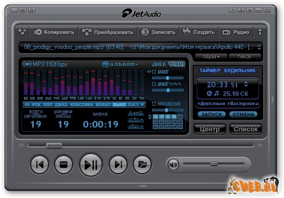 jetAudio — это универсальный проигрыватель музыкальных и видео файлов, риппер, конвертер и т.д., в общем, все в одном комплекте. Программа поддерживает практически все музыкальные форматы, умеет проигрывать MP3, MP2, WAV, MID, REAL AUDIO/VIDEO, S3M, MOD, MPG, AVI, MOV, Video/Audio CD, RealPlayer G2 и некоторые другие форматы мультимедийных файлов. Позволяет записывать аудио компакт-диски или копировать их содержимое на жесткий диск ПК. Есть возможность накладывать на композиции различные эффекты, поддерживается синхронизация для караоке, имеется эквалайзер, конвертер форматов, редактор тэгов, кроссфейдинг, субтитры и т.д.