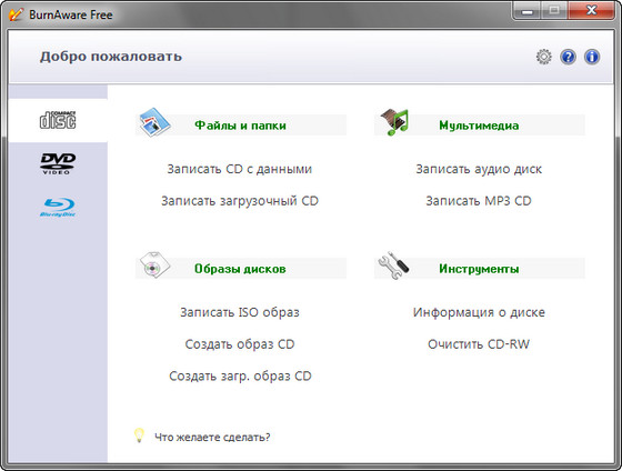 BurnAware Free - относительно небольшая, бесплатная и простая в использовании программа для записи информации и музыкальных композиций на CD, DVD, Blu-Ray и HD-DVD диски, которая пригодится как опытным пользователям, так и новичкам. BurnAware поддерживает работу со всеми типа оптических дисков (включая CD-R/RW, DVD-R/RW, DVD+R/RW, BD-R/RE, HD-DVD-R/RW и DVD-RAM) и аппаратными устройствами записи. Утилита поддерживает создание образов, способна писать мультисессионные диски, имеет опцию проверки записанного содержимого, работает под операционными системами Windows 98/ME/NT/2000/XP/Vista (32/64-bits).