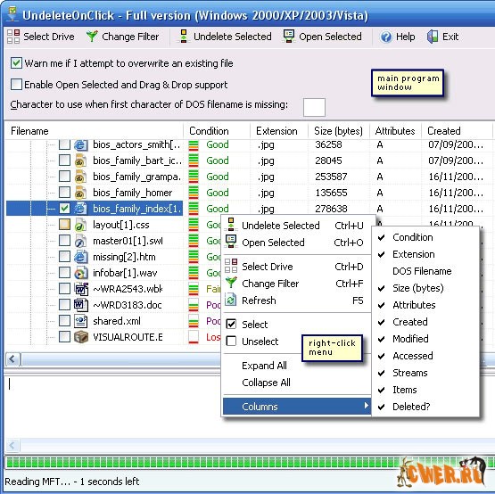 WinUndelete - это отличная программа для нахождения и восстановления удаленных файлов с жесткого диска, а также с дискет, СD, ZIP, MO, JAZ, цифровых камер и различных флэш-накопителей. Поддерживаются следующие файловые системы: FAT12, FAT16, FAT32 NTFS и NTFS5. Программа работает под управлением операционных систем Windows 98/2000/Me/XP/2003/Vista и очень проста в использовании.