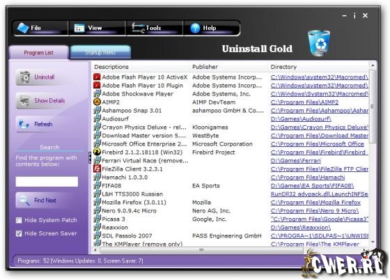 Программа для деинсталляции приложений. Uninstall Gold обладает большим количеством функций: показывает скрытые установленные программы, сортирует список программного обеспечения по заданному фильтру, удаляет некорректно инсталлированные и деинсталлированные программы.