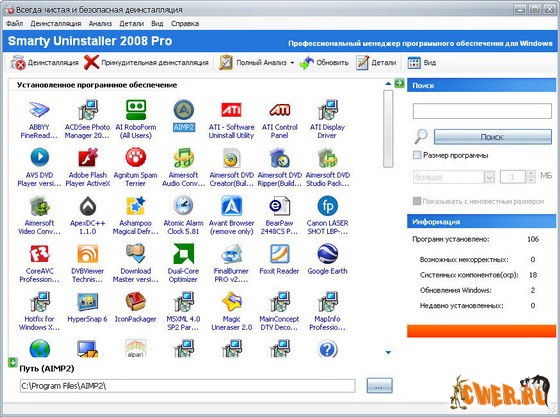 Smarty Uninstaller 2008 обеспечивает решение задач по деинсталляции приложений, установленных на вашем компьютере. Программа является альтернативой стандартной утилите Windows, при этом имеет ряд преимуществ. Может показывать соответствующие значки приложений, дополнительную информацию о каждой установленной программе, а также есть функция поиска приложения по ключевому слову, автоматическое или ручное обнаружение и удаление неисправных ключей реестра. Smarty Analyzer тщательно просканирует компьютер и удалит файлы, оставшиеся от уже удаленных программ.