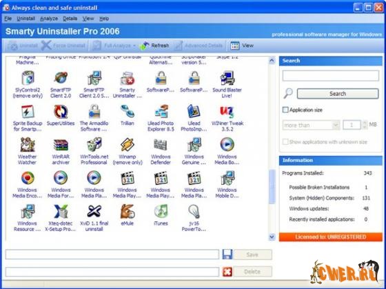 Smarty Uninstaller 2008 - Обеспечивает решение задач по деинсталляции приложений, установленных на вашем компьютере. Он служит заменой стандартному диалогу Добавить/Удалить программу Windows . При этом работает приблизительно в 5-10 раз быстрее. Может показывать соответствующие значки приложений. Имеется функция поиска приложения по ключевому слову.