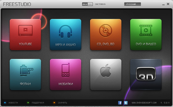 Новый Free Studio Manager - это единый пакет программ в совершенно новом дизайне, объединивший все бесплатные мультимедийные приложения, разработанные DVDVideoSoft. Он состоит из следующих 8 разделов: YouTube, MP3 и Аудио, CD-DVD-BD, DVD и Видео, Фотки, Мобилки, Устройства Apple, 3D. Таким образом, новый интерфейс, включающий в себя все программы, позволяет быстро найти нужную именно вам.