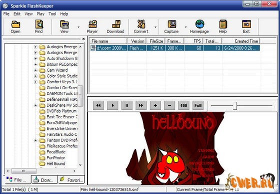 FlashKeeper позволяет вам просматривать Flash-анимации на любом компьютере (даже при отсутствии на нем Flash-плеера), а также с других компов, если они соединены с вашим локальной сетью. При этом вы можете получить о просматриваемом ролике такую информацию, как общее количество содержащихся в нем кадров, количество кадров в анимации, проигрываемое за одну секунду, размеры получаемой картинки и др. С помощью данного программного продукта вы можете также осуществлять поиск Flash-роликов на вашем компьютере или в Сети.