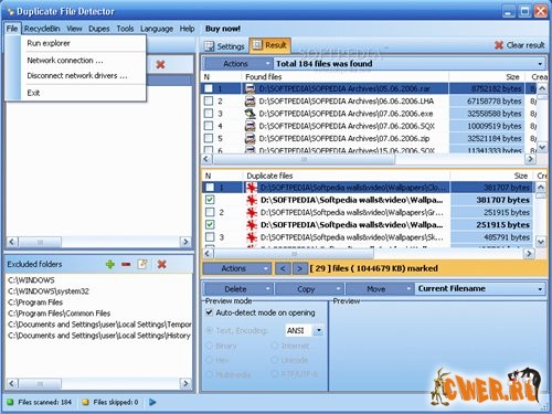 Duplicate File Remover - мощное приложение для поиска и обработки дубликатов файлов на вашем компьютере. Утилита основана на алгоритме детального побайтного ('Byte by Byte') анализа файлов, который подразумевает абсолютную точность при сравнении. Скачав Duplicate File Remover на cwer.ws, вы можете обнаружить копии любого формата, будь то текстовые документы, аудиофайлы, изображения или видео. Для файлов мультимедиа (таких как mp3, ogg, wma) в программе предусмотрена поддержка анализа тэгов: 'Artist', 'Album', 'Title' и 'Comment'. Также поиск поддерживает и сводку файла: заголовок, тему, категорию и автора. Как поступить с обнаруженными копиями - решать вам. Используя Duplicate File Remover, вы можете удалить дубликаты, скопировать их или переместить.