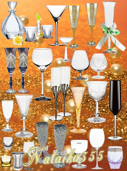 Клипарт из бокалов и фужеров для вина, шампанского, коньяка на прозрачном фоне.