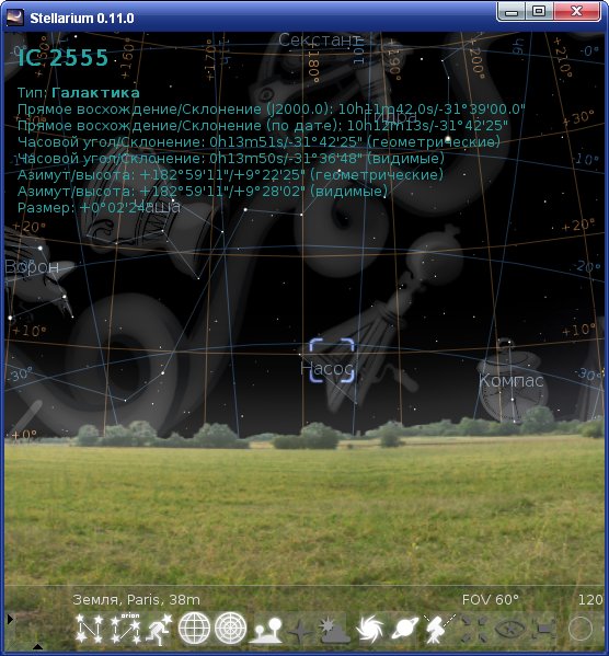Stellarium - астрономическая программа с многоязычным интерфейсом. В масштабе реального времени прорисовывает трехмерное фотореалистичное изображение неба, отображает звезды, созвездия, планеты; имеется карта созвездий со всеми их изображениями, дошедшими до нас от древних. Имеется ночной режим показа, отображение границ созвездий, можно выбрать "домашнюю" планету.