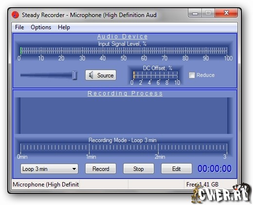 Steady Recorder - неплохая замена встроенному в Windows звуковому редактору. Позволяет записывать с любого источника и сохранять данные в MP3 или WAV форматы. Для контроля записи отображается звуковая форма волны и ее спектр в реальном времени. Имеется встроенный редактор.