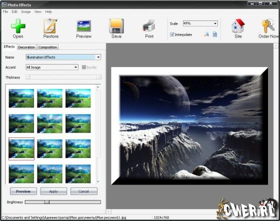 Photo Effects - это новая программа для обработки фотографий при помощи разнообразных фильтров. С её помощью можно полностью преобразить любое изображение. Программа позволяет использовать более 50-ти эффектов, включая как традиционные, так и оригинальные. Вы сможете увидеть свои фотографии на фоне дождя и снега, в тумане и под облаками, добавить солнечный свет или закружить в потоке тайфуна.