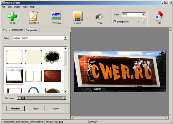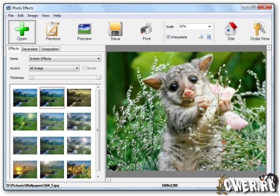 Photo Effects - это программа для обработки фотографий при помощи разнообразных фильтров. С её помощью можно полностью преобразить любое изображение. Программа позволяет использовать более 50-ти эффектов, включая как традиционные, так и оригинальные. Вы сможете увидеть свои фотографии на фоне дождя и снега, в тумане и под облаками, добавить солнечный свет или закружить в потоке тайфуна.