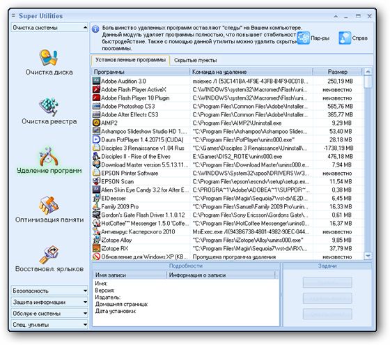 Super Utilities - сборник полезных утилит, при помощи которых вы сможете наладить, очистить и ускорить работу своей операционной системы. Пакет утилит служит для ежедневного использования и позволяет производить поиск и удаление ненужных файлов, очистку и оптимизацию системного реестра, имеет менеджер автозагрузки, а также позволяет производить защиту папок, резервное копирование, анализ папок. Также программа имеет средство для полного удаления ставших ненужными программ, менеджер процессов, менеджер конфиденциальности Internet Explorer и многое другое. В программе имеется простой пользовательский интерфейс с мультиязычной поддержкой, а также имеется поддержка смены скина интерфейса. Работает на платформах Windows 98/Me/2000/XP/2003/Vista.