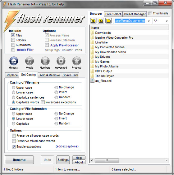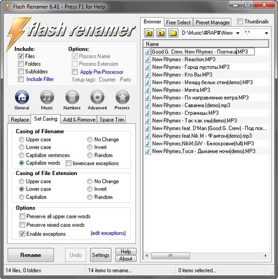 Flash Renamer - программа за считанные секунды позволит превратить непонятные названия файлов в удобные и информативные. Flash Renamer умеет: добавлять, удалять, искать и заменять текст в именах файлов, менять регистр и расширения, работать с MP3 тегами, отменять произведённые переименования и т.д. Отлично работает с папками и файлами всех типов, в том числе и музыкальными.