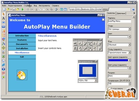 AutoPlay Menu Builder - это один из лучших инструментов для быстрого создания качественных меню автозапуска. При работе с программой Вам не нужно иметь никаких навыков программирования! Достаточно иметь желание, время и немного фантазии . В созданном меню можно открывать документы, запускать приложения, проигрывать мультимедиа-файлы и многое другое.
