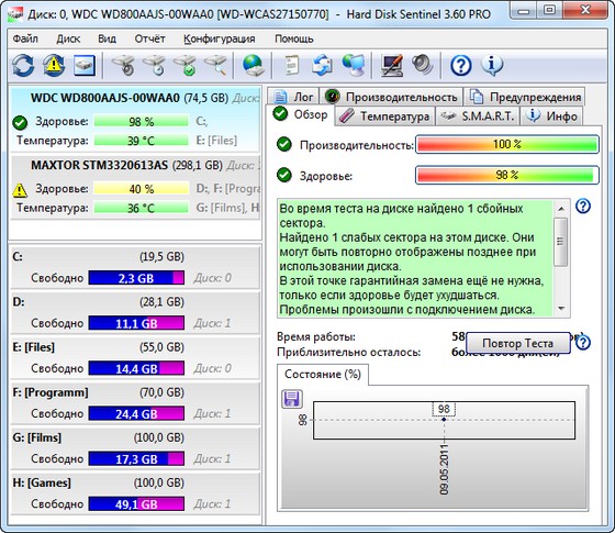 Hard Disk Sentinel - утилита для мониторинга и контроля состояния жестких дисков. Позволяет определить потенциальные проблемы, снижение производительности и возможные сбои. Может предупредить пользователя в случае обнаружения неполадок или превышения температуры.Ее возможности явно не покажутся лишними, особенно в случае особой ценности хранимых данных при росте объема накопителей. Программа отслеживает статус жестких дисков, включая показатели температур и параметры S.M.A.R.T. (Self-Monitoring, Analysis and Reporting Technology, технология, встроенная в большинство современных накопителей) для каждого жесткого диска. Также измеряет скорость передачи данных в реальном режиме (данный показатель может быть использован для тестирования или определения случаев заниженной производительности в тех или иных ситуациях).