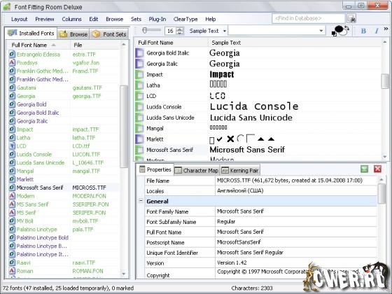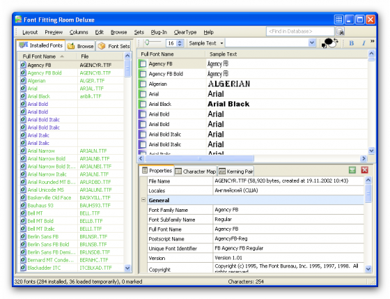 FontMassive - список шрифтов, установка/удаление, таблица символов, просмотр символов в кривых, снимки состояний установленных шрифтов, мн. другое.