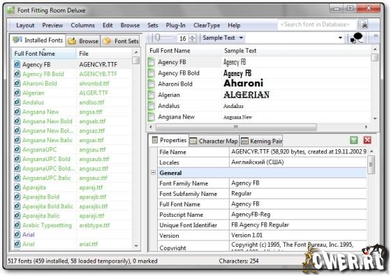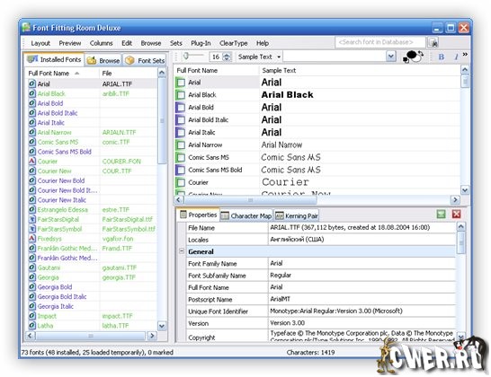 Font Fitting Room - менеджер шрифтов с предварительным просмотром. Предназначен для установки и удаления шрифтов True Type font(*.ttf, *.ttc) и других возможностей других типов шрифтов. В том числе обработка шрифта для более душевного отображения на ЖК(LCD) мониторах.