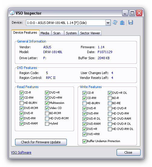 VSO Inspector - бесплатная программа для работы с CD/DVD приводами. С её помощью можно получить подробную информацию об установленных в системе читающих и пишущих приводах. Программа показывает, какие типы дисков читает и записывает привод, какая на нем установлена прошивка; если это DVD привод, то диски какого региона он может воспроизводить. Кроме того, программа может получать разного рода информацию о носителе, находящемся в приводе (производитель диска, его размер, поддерживаемая скорость записи, в какой программе записывали тот или иной диск). Утилита умеет сканировать диски на ошибки и проверять читаемость файлов.