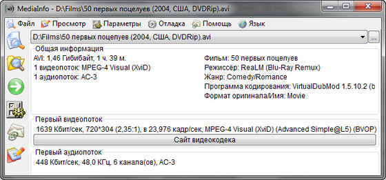 Вышла новая версия бесплатной программы, которая предоставляет подробную информацию об аудио и видео файлах. Программа показывает, каким кодеком сжато видео, с каким битрейтом, какое в нем соотношение сторон и количество кадров в секунду. Для аудиофайла MediaInfo показывает используемый кодек, битрейт, язык, количество каналов, частоту выборки и т.д. Показав сведения о файле, программа тут же посоветует, где можно скачать недостающий кодек или проигрыватель.