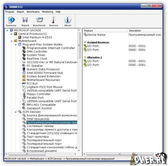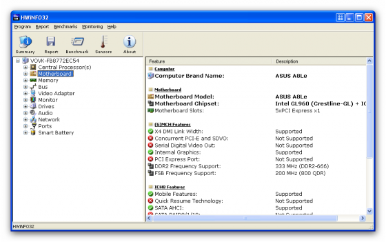 HwInfo32 - программа, выдающая подробнейшую информацию обо всем «железе» вашего компьютера, начиная с видеокарты и заканчивая самым законспирированным чипом на материнской плате. HWiNFO32 просто незаменима для всех, кто привык ковыряться в «харде», особенно чужом. HWiNFO32 предоставляет информацию исключительно об аппаратном обеспечении. Она распознает всевозможные микропроцессоры (вплоть до Itanium!), определяет их параметры, вычисляет реальную частоту FSB; получает исчерпывающую информацию о материнских платах и BIOS; считывает данные из SPD модулей памяти; идентифицирует сотни видеоакселераторов и более 400 графических чипов, а с помощью DDC - и характеристики мониторов (например, такой полезный параметр, как реальная дата производства).