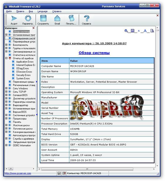 WinAudit - программа для проведения анализа конфигурации компьютера и установленного на нем программного обеспечения, а также проверки сетевых настроек, конфигурации системы безопасности и т.д. Работает без инсталляции, выдает подробный отчет в своем окне с возможностью сохранить его в форматах TXT, HTML, CSV или PDF.