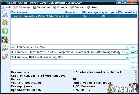 VideoInspector - отображает информацию о видеофайле - сведения о видеокодеке, которым был закодирован файл, об аудиокодеке, видеоразрешении, FPS, BitRate, Qualite Factor и другие. Поддерживаются форматы AVI, Matroska, MPEG I, MPEG II, QuickTime. Кроме этого, VideoInspector имеет еще одну очень полезную опцию, а именно возможность быстрого перехода на веб-страницу для загрузки недостающего кодека.