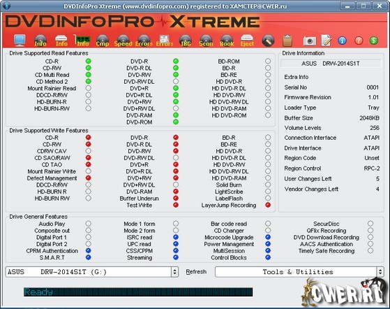 DVDInfo Pro - утилита для тестирования и получения подробной информации о CD/DVD-приводах. Кроме этого, данная программа позволяет тестировать установленные в привод компакт-диски и DVD, а также быстро стирать и форматировать диски DVD-R/RW и DVD+R/RW. Поддерживаются практически все виды приводов, включая DVD+R DL (Double Layer), и все виды дисков, включая Blu-ray и HD-DVD. В последних версиях программы интегрирована поддержка устройств USB и FIREWIRE и таких технологий, как DDCD, Mt Rainier и HD-BURN. При желании вы сможете изменить цвета представления программных настроек и сделать скриншот окна, в котором выводятся параметры диска...