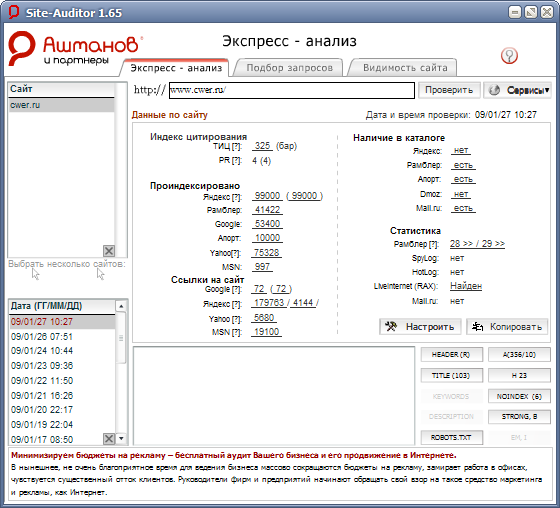 При помощи утилиты Site-Auditor Вы сможете быстро собрать данные, необходимые для оценки видимости сайта в Рунете.