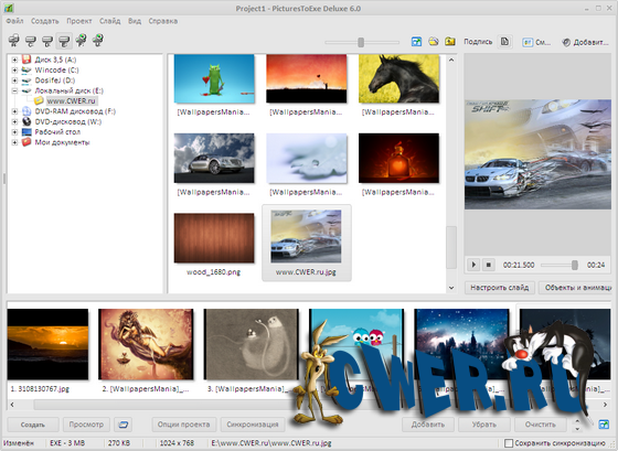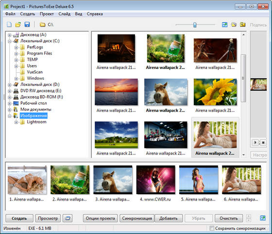 PicturesToExe - улучшенная версия программы для самостоятельного создания красивых слайд-шоу с помощью применения разных эффектов, музыки, 3D-эффектов, анимации и титров.