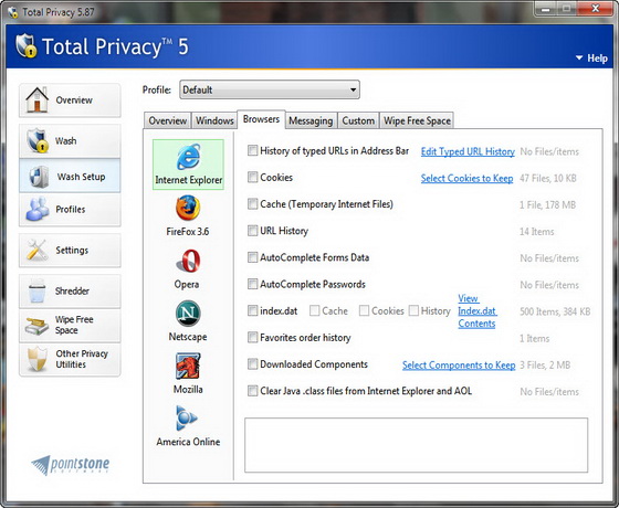 Маленькая, компактная программа One Click Privacy автоматически или всего одним щелчком, подтирает историю и следы интернет - активности от злонамеренного или любопытного глаза. Убирает историю браузеров, куки, вводимые пароли, ID's, банковские операции и информацию о кредитных картах. Убирает следы работ пиринговых клиентов, включая Bit Torrent Client, Kazaa, LimeWire, Morpheus и других. Стирает следы переписки и голосовые протоколы и т д.