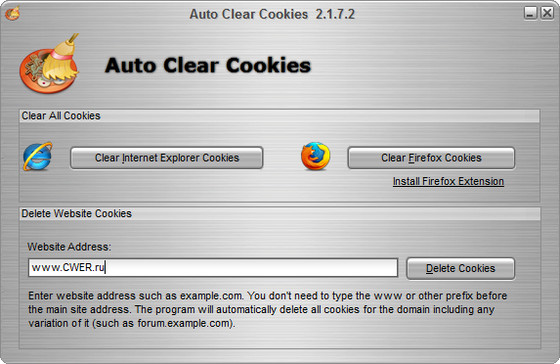 Auto Clear Cookies является мощным средством, которое позволит Вам стереть cookies с одного веб-сайта или доменного имени, или очистить все cookies из браузера Internet Explorer и Mozilla Firefox.