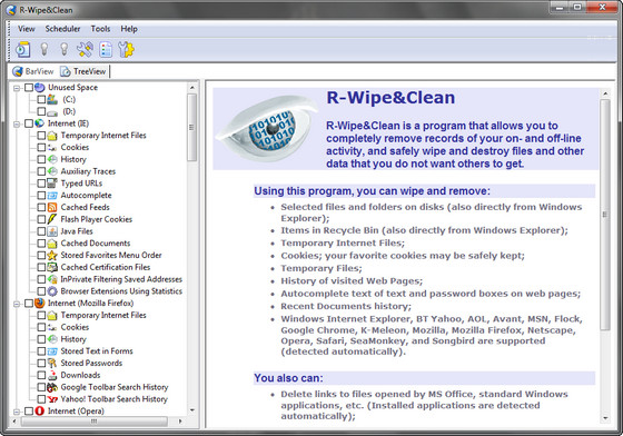 R-Wipe & Clean - эффективная утилита очистки дискового пространства и сохранения конфиденциальности информации. Это приложение полностью удалит временные интернет файлы, журнал посещенных страниц, кукисы, автозаполняемые формы и пароли, файлы подкачки, список недавно использовавшихся документов, список часто используемых компонентов, хранящихся в системном реестре, временные файлы и многое другое. Сделает невозможным восстановление конфиденциальной информации о вашей сетевой или локальной активности. Также программа удалит оставшуюся на компьютере информацию о работе более чем 200 приложений. Утратившие необходимость файлы и папки могут быть объединены в списки и удалены за один раз. Программой поддерживаются файловые системы FAT и NTFS. Различные задачи программы могут быть объединены в одну или более процедур и выполнены как сразу, так и в определенное время или при определенном событии в автоматическом режиме.