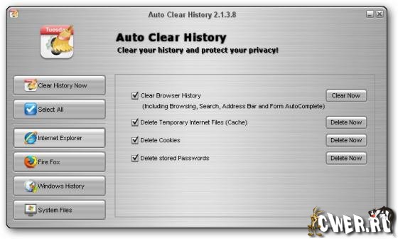 Auto Clear History - программа для удаления следов пребывания пользователя за компьютером. Программа эффективно очистит cookies, кеш браузеров, введённые адреса и ссылки, а также очистит историю работы пользователя с более чем сотней самых популярных программ - офисные пакеты, архиваторы, проигрыватели и прочее.