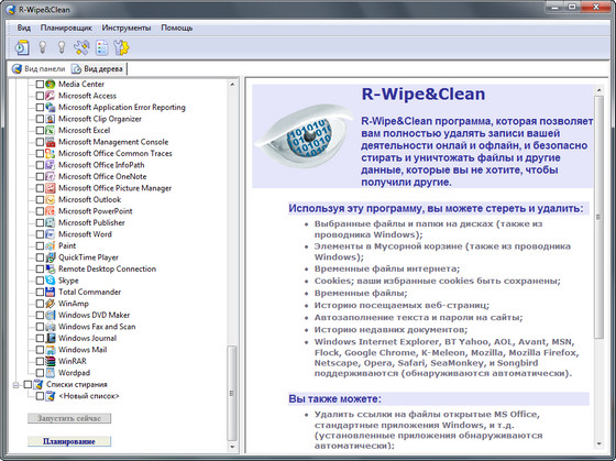 R-Wipe & Clean - эффективная утилита очистки дискового пространства и сохранения конфиденциальности информации. Это приложение полностью удалит временные интернет файлы, журнал посещенных страниц, кукисы, автозаполняемые формы и пароли, файлы подкачки, список недавно использовавшихся документов, список часто используемых компонентов, хранящихся в системном реестре, временные файлы и многое другое. Сделает невозможным восстановление конфиденциальной информации о вашей сетевой или локальной активности. Также программа удалит оставшуюся на компьютере информацию о работе более чем 200 приложений. Утратившие необходимость файлы и папки могут быть объединены в списки и удалены за один раз. Программой поддерживаются файловые системы FAT и NTFS. Различные задачи программы могут быть объединены в одну или более процедур и выполнены как сразу, так и в определенное время или при определенном событии в автоматическом режиме.