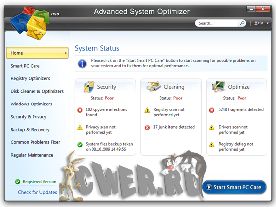 Advanced System Optimizer - программное решение для настройки и оптимизации работы вашей системы. Это легкий и самый лучший способ для сохранения производительности и безошибочной работы вашей системы. Программа содержит в себе более 30 различных инструментов для улучшения производительности и скорости работы вашей операционной системы. С помощью этой программы вы сможете чистить жесткий диск от ненужных файлов и различного мусора, проделывать чистку и дефрагментацию системного реестра, удалять конфиденциальные данные (кукисы, история сайтов, кеш и любые другие следы вашей активности), а также создавать резервную копию системных файлов и, при надобности, восстанавливать их.