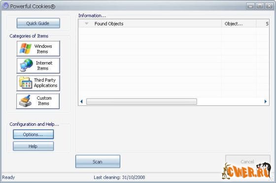 Программа Powerful Cookies позволяет удалить все следы пребывания в интернет: посещенные сайты, историю переходов браузера, временные файлы, Cookies, кэш браузера, недавно открытые файлы и документы, при этом вся очистка делается вполне корректно без всяких приключений и проблем. Теперь вам не понадобится делать многочисленные движений мышкой чтобы удалить все следы вашего пребывания в интернете. Также хочется отметить, что программа Powerful Cookies позволяет очищать и index.dat, что невозможно сделать ручками (система не позволяет), а именно в этом файле и хранится важная информация ваших посещений.