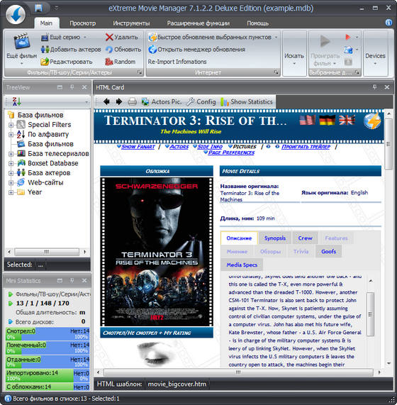 eXtreme Movie Manager - лучшая программа для ведения домашней фильмотеки. Для каждого фильма предоставлено более 70 (!) полей описания, разделенных по подгруппам. Возможность импорта данных со специализированных сайтов, есть возможность создания собственного импорт-скрипта. Программа поддерживает все существующие сегодня форматы файлов от *.avi и *.mpg до RealMedia. При помощи программы можно не только вести учет коллекции, но и воспроизводить видеофайлы. Программа имеет возможность сканировать диск на наличие имеющихся на винчестере мультимедийных файлов, разрешение которых вы укажете в настройках, и автоматически составляет из них каталог.