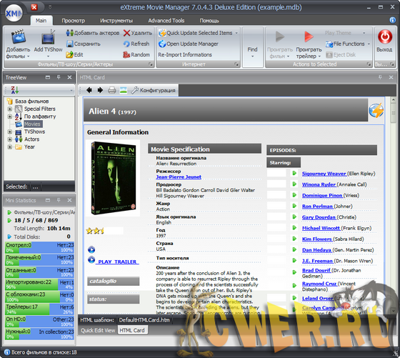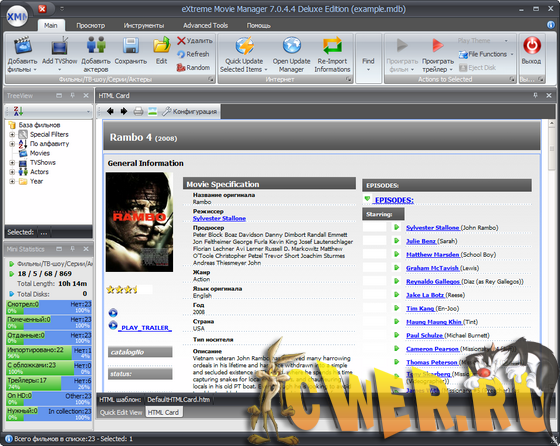 eXtreme Movie Manager Deluxe Edition - лучшая программа для ведения домашней фильмотеки. Для каждого фильма предоставлено более 70 полей описания, разделенных по подгруппам. Возможность импорта данных со специализированных сайтов, есть возможность создания собственного импорт-скрипта. Программа поддерживает все существующие сегодня форматы файлов от *.avi и *.mpg до RealMedia. При помощи eXtreme Movie Manager Deluxe Edition можно не только вести учет коллекции, но и воспроизводить видеофайлы. Программа имеет возможность сканировать диск на наличие имеющихся на винчестере мультимедийных файлов, разрешение которых вы укажете в настройках, и автоматически составляет из них каталог.