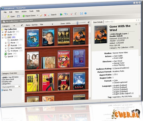 MediaMan - программа, которая позволяет организовать на компьютере каталог медиа-носителей. Их список довольно широк: программы, игры, DVD, CD, VHS и даже книги. Причем, вам не обязательно описывать тот или иной носитель - в утилите заложены возможности импорта информации о фильме или программе через Интернет. Вы можете выставлять различные статусы для элементов каталога, делить элементы на подгруппы и даже экспортировать каталог на ваш карманный компьютер. В программе предусмотрен удобный поиск по созданному каталогу.