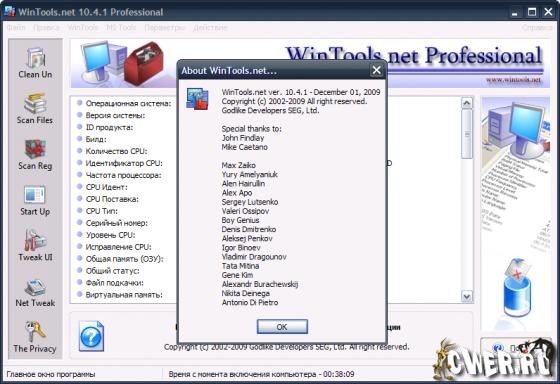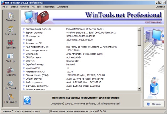 WinTools.net - набор инструментов, предназначенный для повышения стабильности операционной системы Windows и поддержания производительности на высоком уровне на протяжении всего эксплуатационного периода. Не смотря на свой маленький размер, программа с некоторыми функциями справляется лучше даже чем System Mechanic 8 Professional. В состав программы входят следующие инструменты: Clean Uninstaller, Scan Files, Scan Shortcuts, Scan Registry, Startup Manager, Tweak UI, Net Tweaker, The Privacy, Invisible Man, File Shredder...